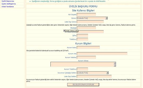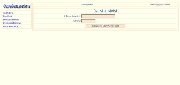 | Siteye giriş yapabilmek için üyelik işlemleri yapmanız gerekmektedir. Bunun için öncelikle ana sayfadaki üyelik başvuru menüsünü kullanarak üyelik başvuru işlemlerini tamamlayın. Üyelik başvuru menusu aşağıda görüldüğü gibidir. Burada e-posta adresiniz ve şifreniz bundan sonraki işlemlerde kullanımınız için gerekli olduğundan hatırlayacağınız bir e-posta adresi ve şifre girmeyi unutmayın. |