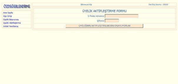 | Üyelik işlemlerinin onaylandığına dair e-posta aldıktan sonra ana menüden Üyelik Aktifleştirme menüsünü kullanarak üyeliğinizi aktifleştirmeniz gerekmektedir. Bu menüye girdiğinizde karşınıza aşağıdaki menü gelecektir, buraya başvuru sırasında kullandığınız e-posta adresinizi ve şifrenizi girerek aktifleştirme işlemlerinizi gerçekleştirebilirsiniz. |